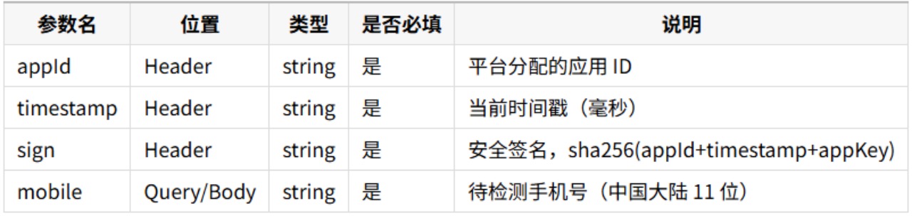在请求体或 URL 参数中传入 mobile(待检测手机号)。