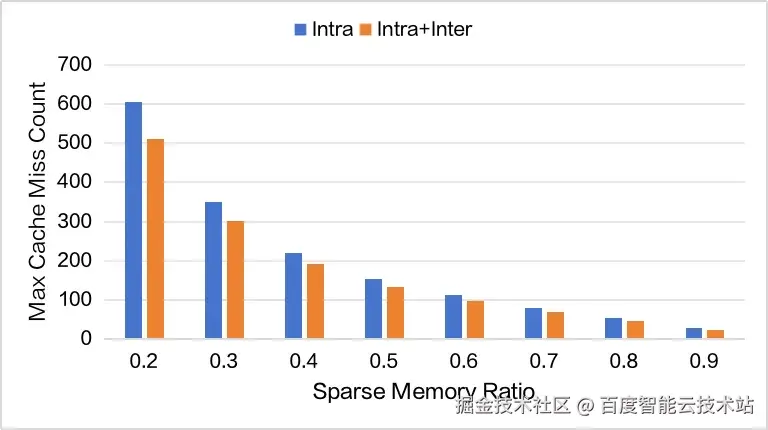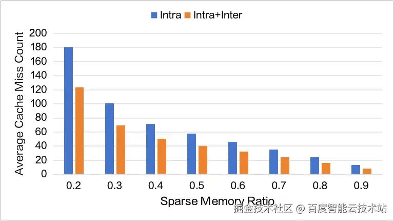 图 7 展示了依据 Intra-Layer Access 构建 Sparse Memory Pool 后,每个 batch 的平均 Cache Miss 数量。我们进一步在不同的 Sparse Memory Ratio 下进行了对比分析,这些结果共同刻画了在不同显存预算下可获得的性能收益边界。
