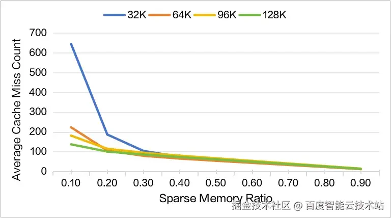 如图 13 所示,随着上下文长度的增加,当 Sparse Memory Ratio ≥ 0.2 时,平均 Cache Miss 维持在相对稳定的水平。需要特别指出的是,在 32K 上下文条件下,当 Sparse Memory Ratio 较小时会出现最严重的 Cache Miss。