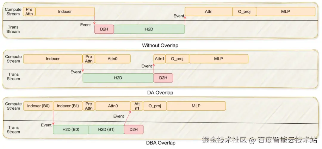 在不启用 Overlap 的情况下,这两类数据传输均必须等待 Indexer 计算完成后才能启动,而后续的 Attention 计算又必须在所有传输结束后才能继续执行。这样的严格依赖使得不同阶段无法并行,最终构成一条完全串行的执行链路,从而显著限制了整体吞吐。