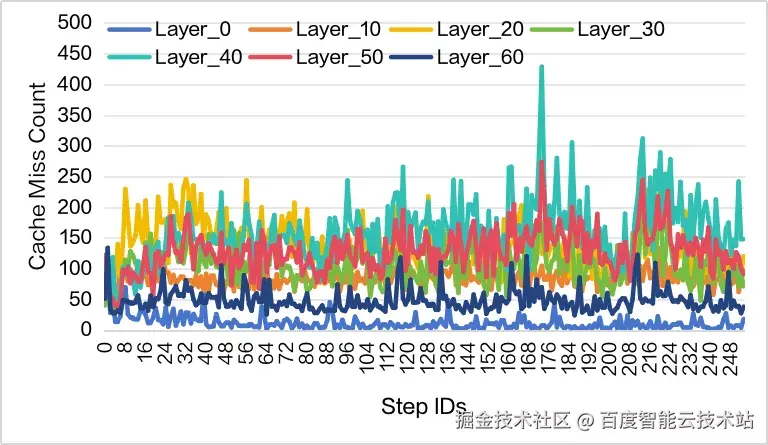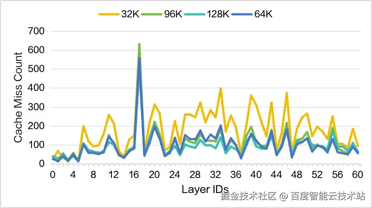 首先,我们观察到在不同的上下文长度下,各层的 Cache Miss 沿 LayerID 的分布趋势具有高度一致性(如图 12 所示)。因此,我们可以通过预先测试,识别出在推理过程中最容易产生大量 Cache Miss 的关键层。