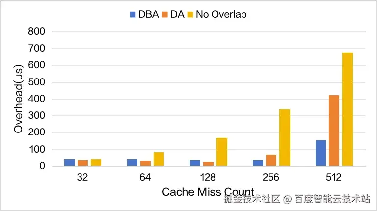 如图 11 所示,我们评估了三种 Overlap 策略在不同 Cache Miss Count 下的性能退化情况。在 DBA Overlap 策略中,Indexer 的计算成本会随着上下文长度线性增长,使其能够在长上下文场景中有效隐藏 Latent-Cache 的传输延迟。因此,当 Cache Miss Count 达到 512 时,DBA 由于有足够的 overlap 空间依然能够保持较高的效率。而在 Cache Miss 较低的情况下,DA Overlap 更具优势,因为它能够在不引入 Indexer 划分开销的前提下完全隐藏数据传输延迟。