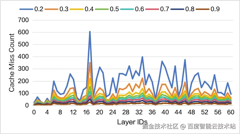 图 12. 不同上下文情况不同层的 Cache Miss 对比,MTP=2,Sparse Memory Ratio=0.2