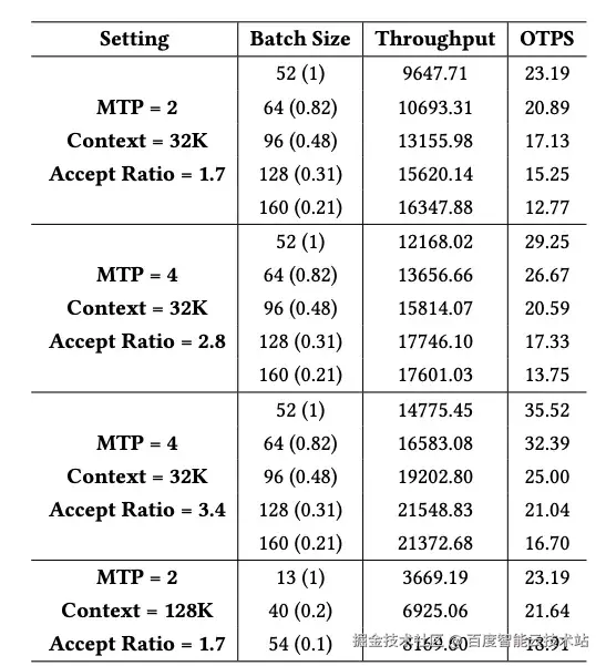 在本实验中,我们评估了 32K 上下文条件下,不同 MTP 值和接受率下的性能表现,同时将其他所有配置保持与表 1 一致。根据模拟器输出的吞吐和 OPTS 结果(表 2),可以看到:MTP = 2 能够带来 69.4% 的端到端吞吐提升;当 MTP = 4 且接受率为 3.4 时,端到端吞吐提升为 45.8%。