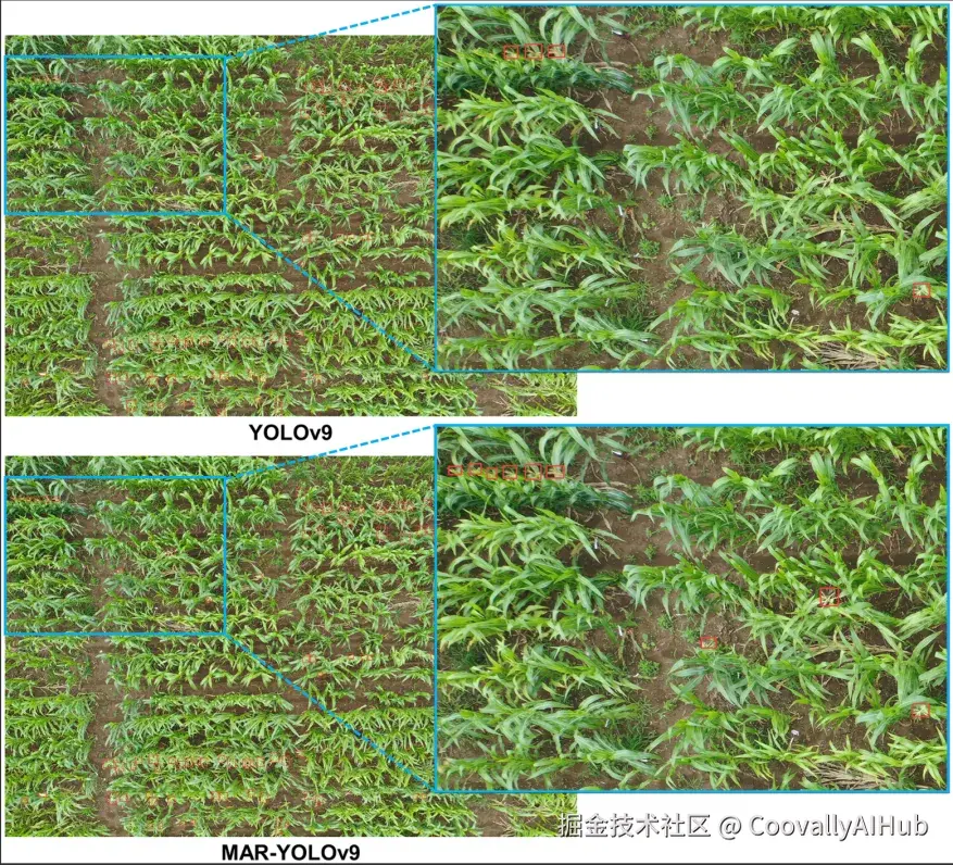 在密集种植场景中,MAR-YOLOv9能够更准确地检测小尺寸的作物目标,减少漏检。