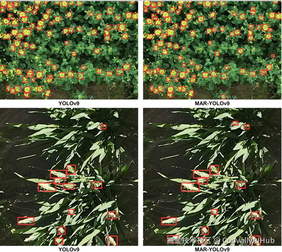 面对叶片遮挡严重的场景,MAR-YOLOv9表现出更好的鲁棒性,能够识别部分可见的目标。