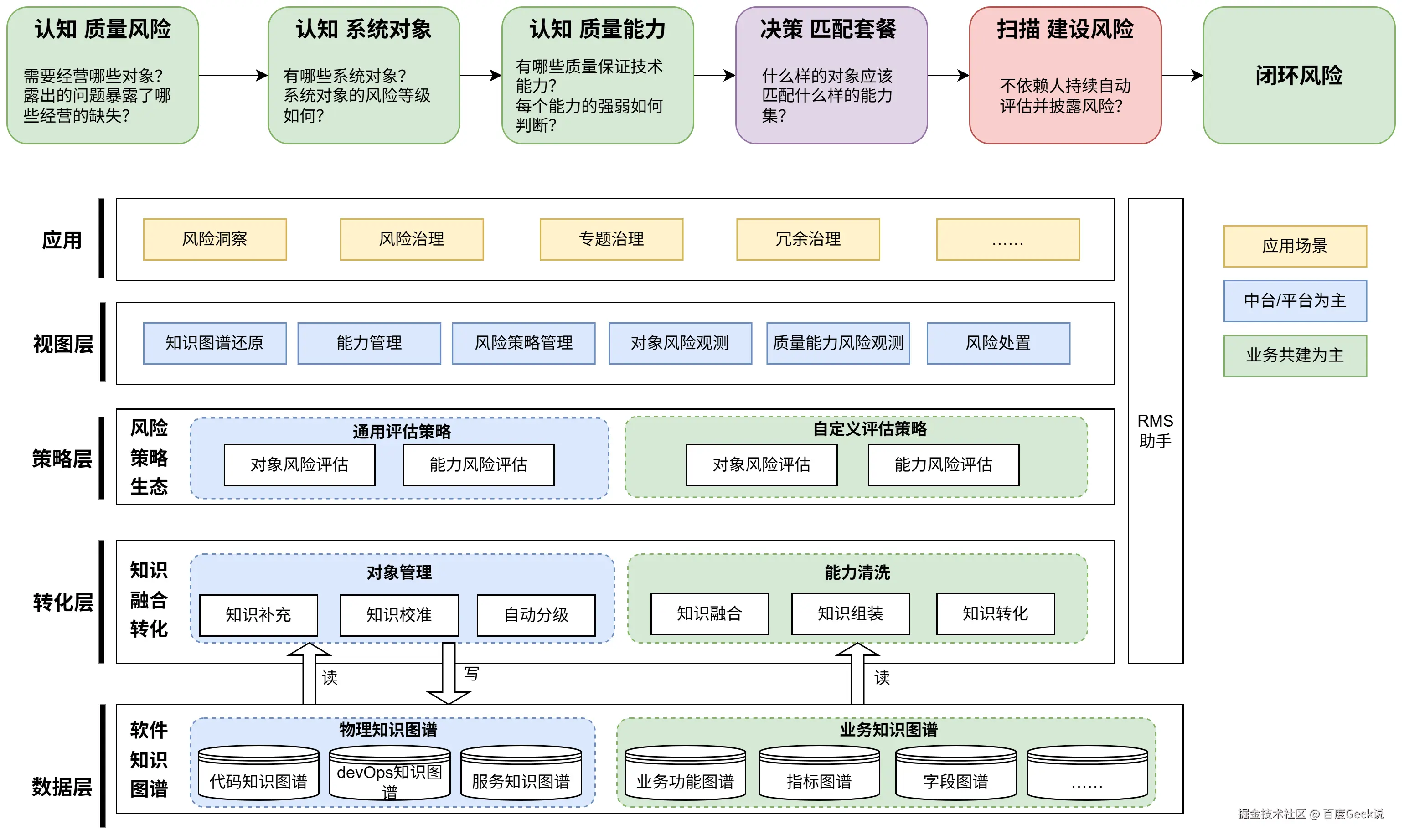 RMS旨在从模式上 、成本上 、效果上重塑质量风险管理过程,****打破业务间壁垒,最大化降低业务质量经营成本。****整体方案依托软件知识图谱,以一站式质量经营为导向,构建包括实体对象管理、质量能力管理、风险策略管理、风险观测、风险分发处置等通用能力。标准能力支持业务自主拼装、插拔式使用,实现风险从认知到闭环的全流程管理。支持各种质量角色的参与,协同以达到持续提升质量经营水平的目的。