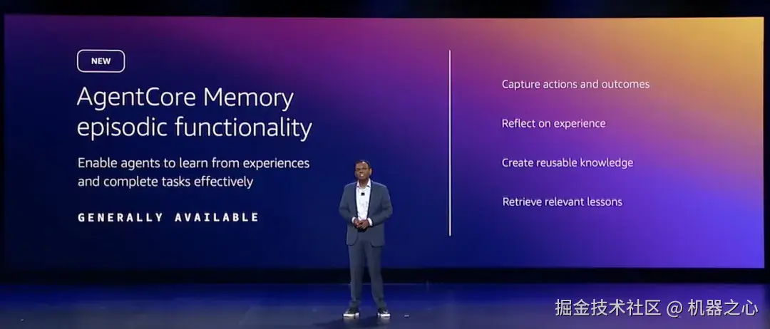 AgentCore Memory 引入了全新的情景式功能,能够帮助 Agent 从过往经验中(上下文、推理、操作和结果)学习,让 AI 随着时间的推移逐步构建对用户的连贯理解,进而输出更加智能化的决策。