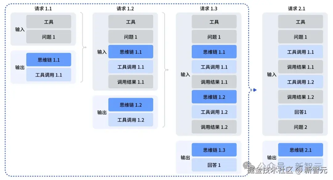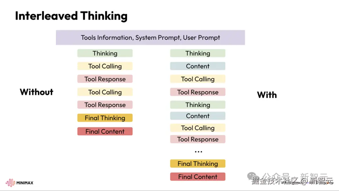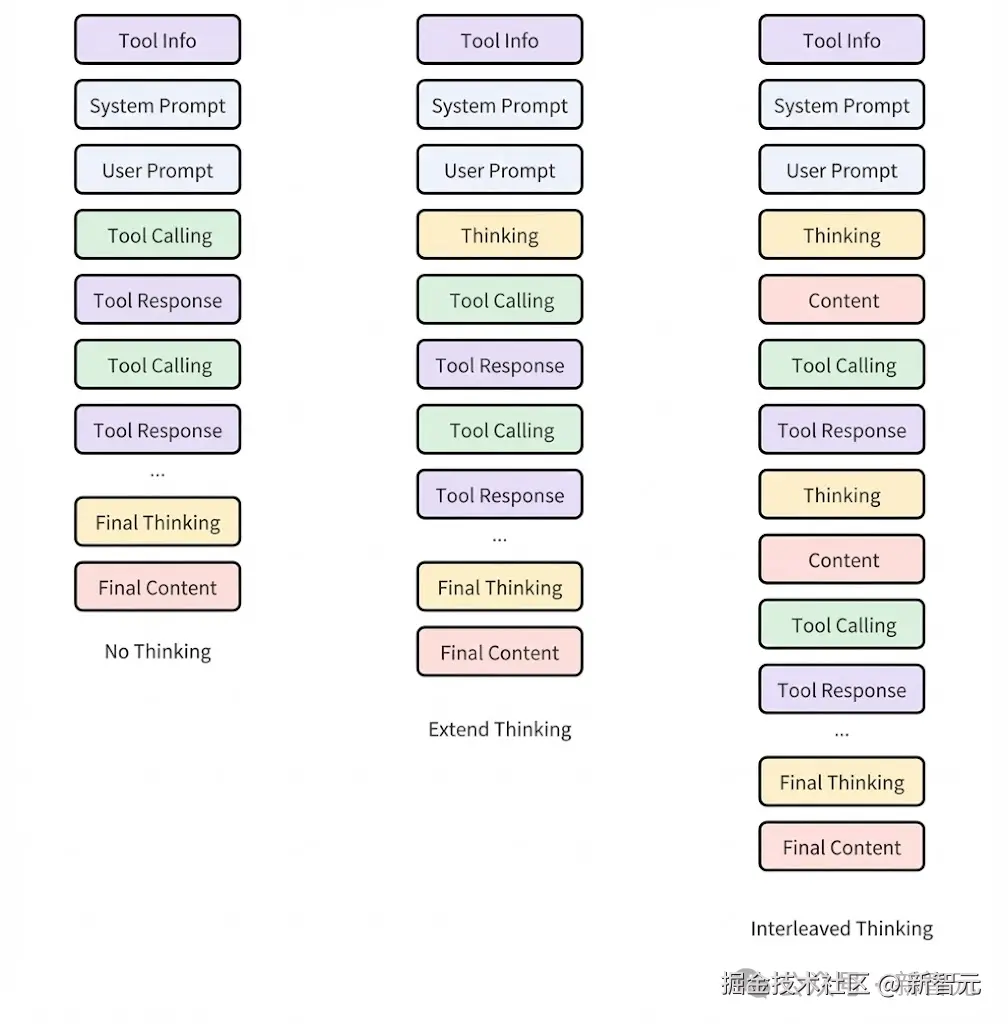MiniMax 等部分厂商也将其称作 「Interleaved Thinking(交错思维链)」,从示意图即可看出,二者本质上是等价的。这是一个更贴近技术的称呼。