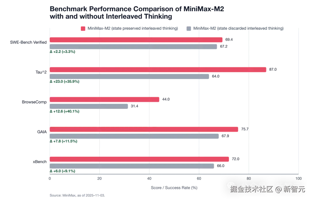 MiniMax M2 的发布数据中,有一组数据有力说明了这一机制的效果。