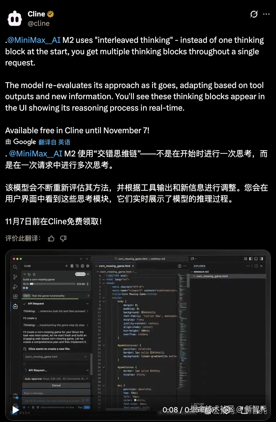 - 「Cline」:这是 VS Code 上最火的 AI 编程插件之一。MiniMax 团队与其紧密合作,修改了底层的消息处理逻辑,确保在 IDE 的对话历史中,不仅保留代码,还保留模型的思考过程。这直接让 M2 在 Cline 里的表现从「不可用」变成了「丝滑」。
