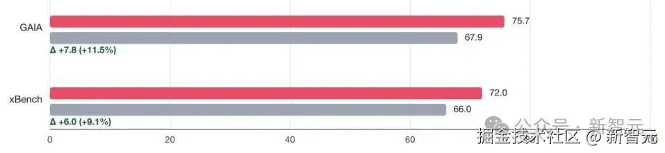 然而,在 **BrowseComp(网页浏览任务)**上,提升幅度达到了惊人的 「40%」 (从 31.4 飙升至 44.0);在 Tau² 这种复杂推理任务上,提升了 「36%」。