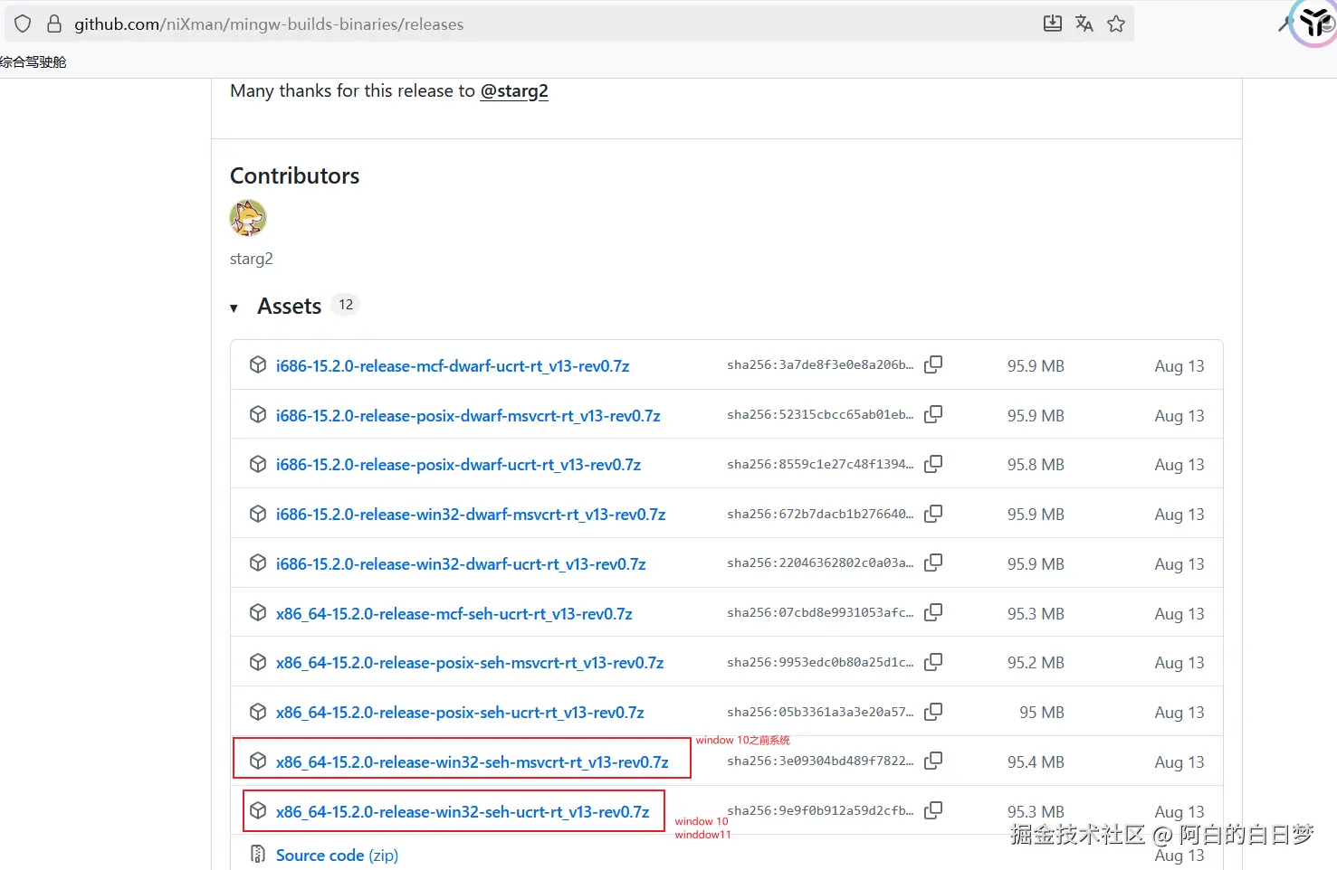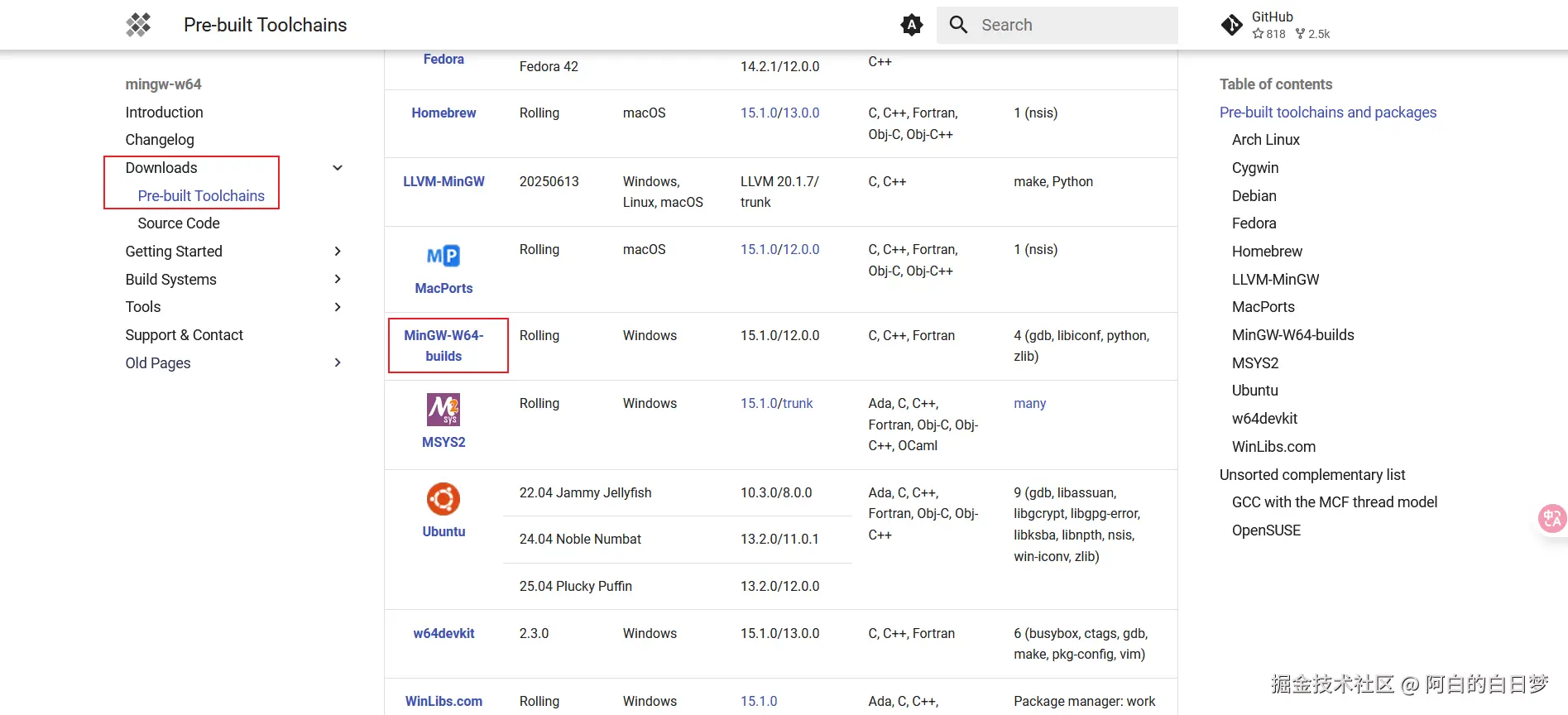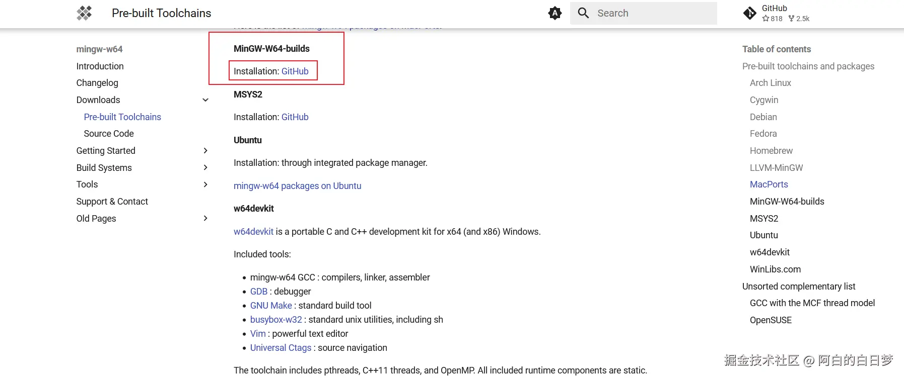 MinGW-w64的官网,然后点击左侧菜单Downloads的Pre-built Toolchains可以看到如下页面