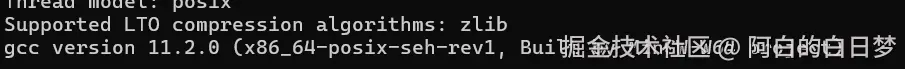 gcc -v命令,点击enter按键运行,没有报错,然后出现很长的文字,最后有如下版本信息,表示MinGW安装成功