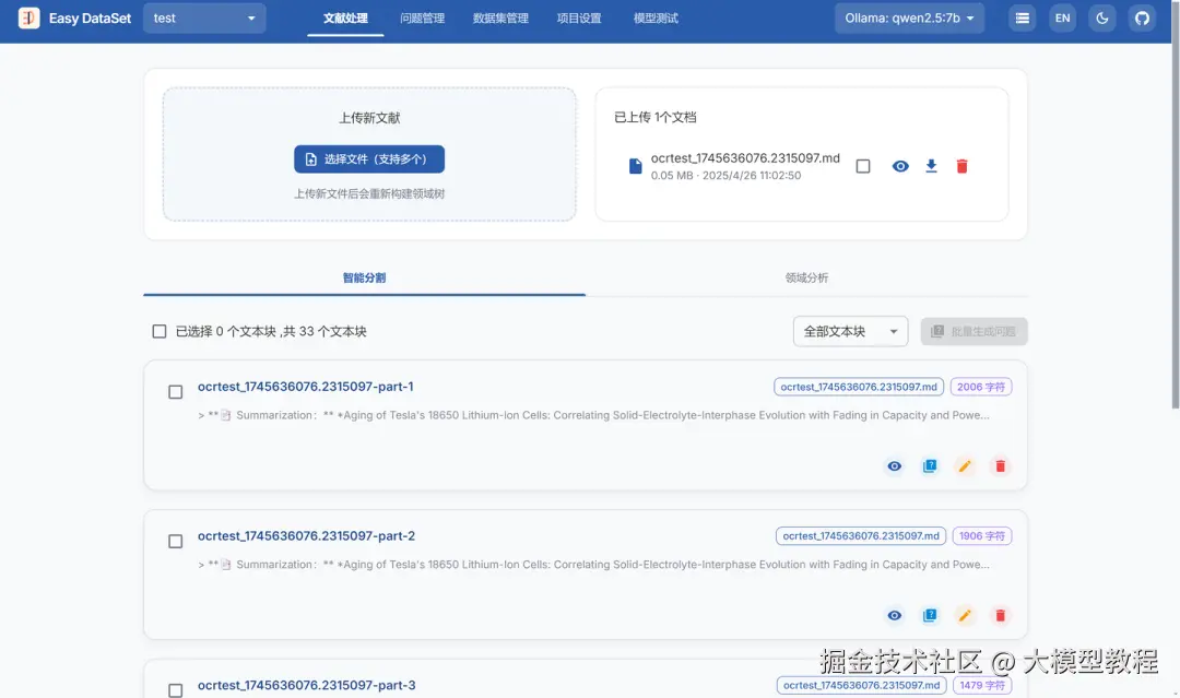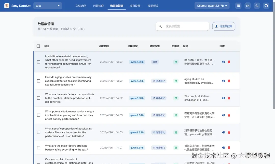 在当前的AI水平下,让大语言模型辅助实现问答对的构造已经是一个很常见的策略了。这边我们可以使用一个国产开源工具Easy-dataset进行处理。