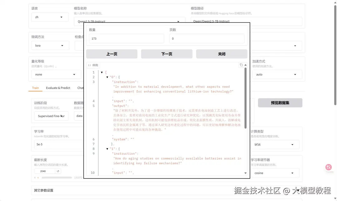 安装完成后,按照文档中的要求,导入我们刚才生成的数据集到data文件夹下 ,之后记得在data_info.json进行注册,启动llamafactory之后我们便可以预览数据集了