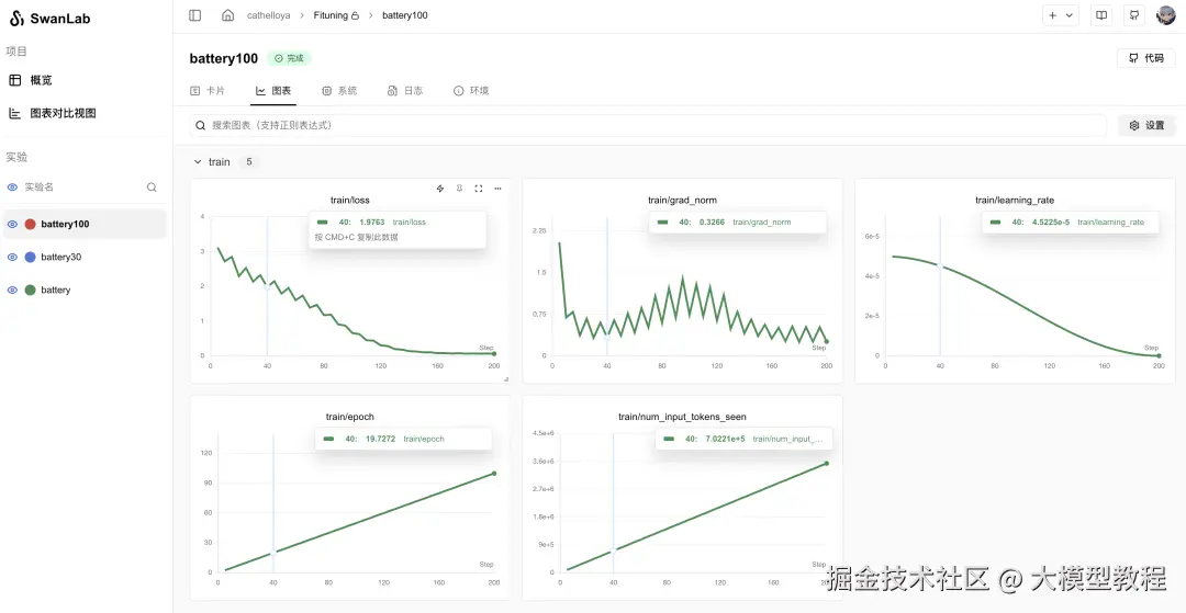 在Swanlab中,我们也可以查看刚才训练的各项参数曲线,下面的是我训练过程的参数曲线(这边我简略地设置了下训练参数,效果可能不佳,具体的需要考虑数据集的数量,基模型大小等因素)