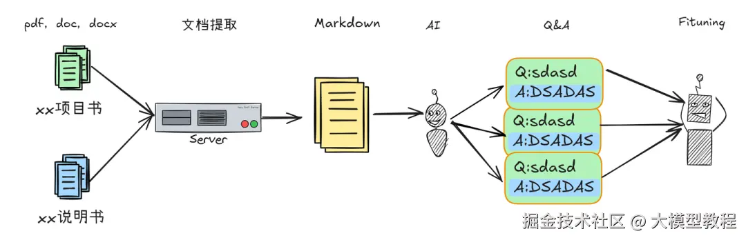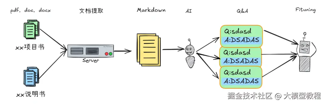 本文的思路展示,收集领域知识文档→统一转换为Markdown格式→构造微调数据集→微调大语言模型