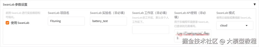 为了微调大语言模型,这边我们可以使用llamafactory进行微调,Swanlab进行模型训练的监测,由于llamafactory是自带Swanlab适配的,所以仅需要在llamafactory中配置Swanlab秘钥即可。