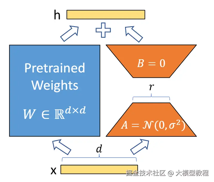 Lora微调原理,在大模型权重文件的输出时,再添加一个可训练的低秩矩阵