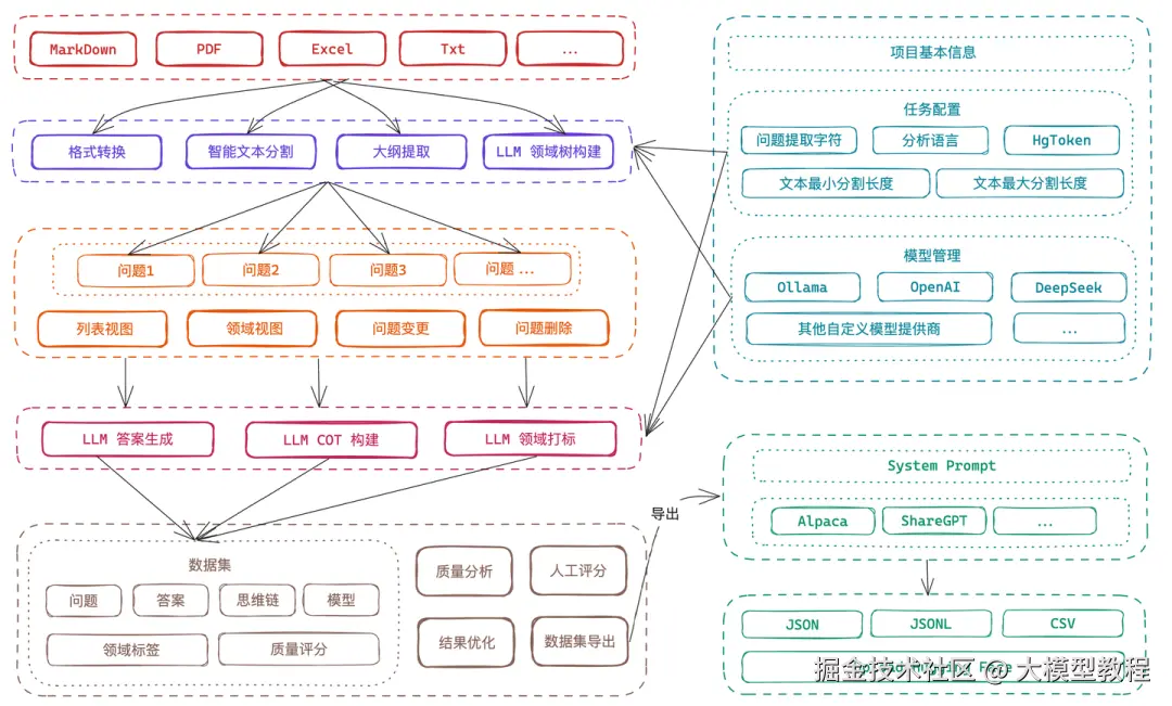 总的来说,Easy-dataset通过我们上传的Markdown文件,将文本内容进行分割,之后让大语言模型对每个分割的片段进行提问,在生成所有的问题之后,再利用相关的片段与生成的问题对大语言模型进行提问,从而实现了将文档知识变成问答对的形式。