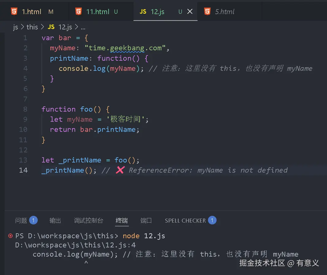 this.myName------ 代码中压根没写this; - 它也不是 局部变量 ------ 函数内部没有用