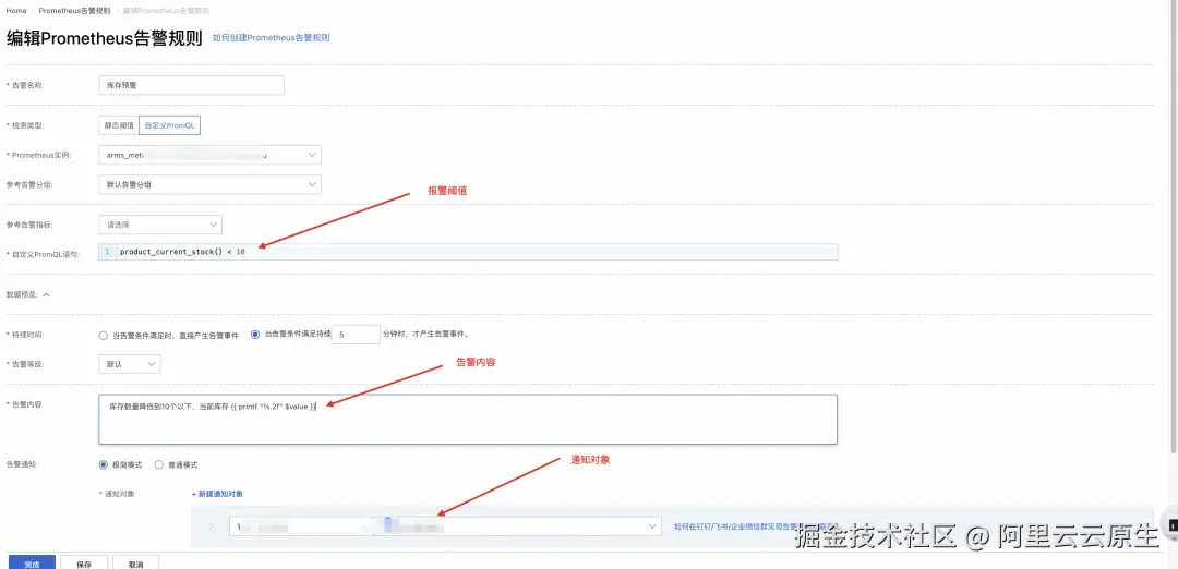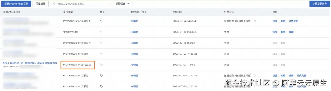1\] Prometheus 监控实例列表页面 [arms.console.aliyun.com/#/prom/cn-h...](https://link.juejin.cn?target=https%3A%2F%2Farms.console.aliyun.com%2F%23%2Fprom%2Fcn-hangzhou "https://arms.console.aliyun.com/#/prom/cn-hangzhou") \[2\] Prometheus 告警规则页面 [arms.console.aliyun.com/#/prom/aler...](https://link.juejin.cn?target=https%3A%2F%2Farms.console.aliyun.com%2F%23%2Fprom%2Falert%2Fcn-hangzhou "https://arms.console.aliyun.com/#/prom/alert/cn-hangzhou") \[3\] 创建 Prometheus 告警规则 [help.aliyun.com/zh/arms/pro...](https://link.juejin.cn?target=https%3A%2F%2Fhelp.aliyun.com%2Fzh%2Farms%2Fprometheus-monitoring%2Fcreate-alert-rules-for-prometheus-instances "https://help.aliyun.com/zh/arms/prometheus-monitoring/create-alert-rules-for-prometheus-instances") 点击[此处](https://link.juejin.cn?target=https%3A%2F%2Fwww.aliyun.com%2Fproduct%2Farms%3Fspm%3Da1z389.11499242.0.0.65452413yOc5rP%26utm_content%3Dg_1000408142 "https://www.aliyun.com/product/arms?spm=a1z389.11499242.0.0.65452413yOc5rP&utm_content=g_1000408142"),立即体验 ARMS。 本文由阿里云 ARMS 团队出品