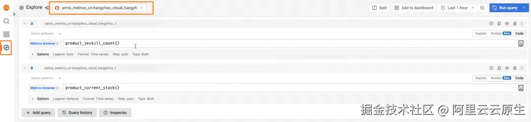 - 单击该示例右侧共享版进入 Grafana 页面,然后单击 Explore,选择数据源为上一步对应的 Prometheus 实例名称。