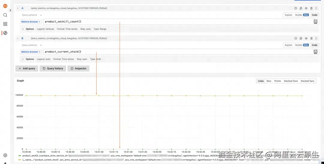 - 您可以通过 PromQL 简单查询在代码中定义的指标,如下图所示,也可以在 Grafana 中自定义展示大盘。