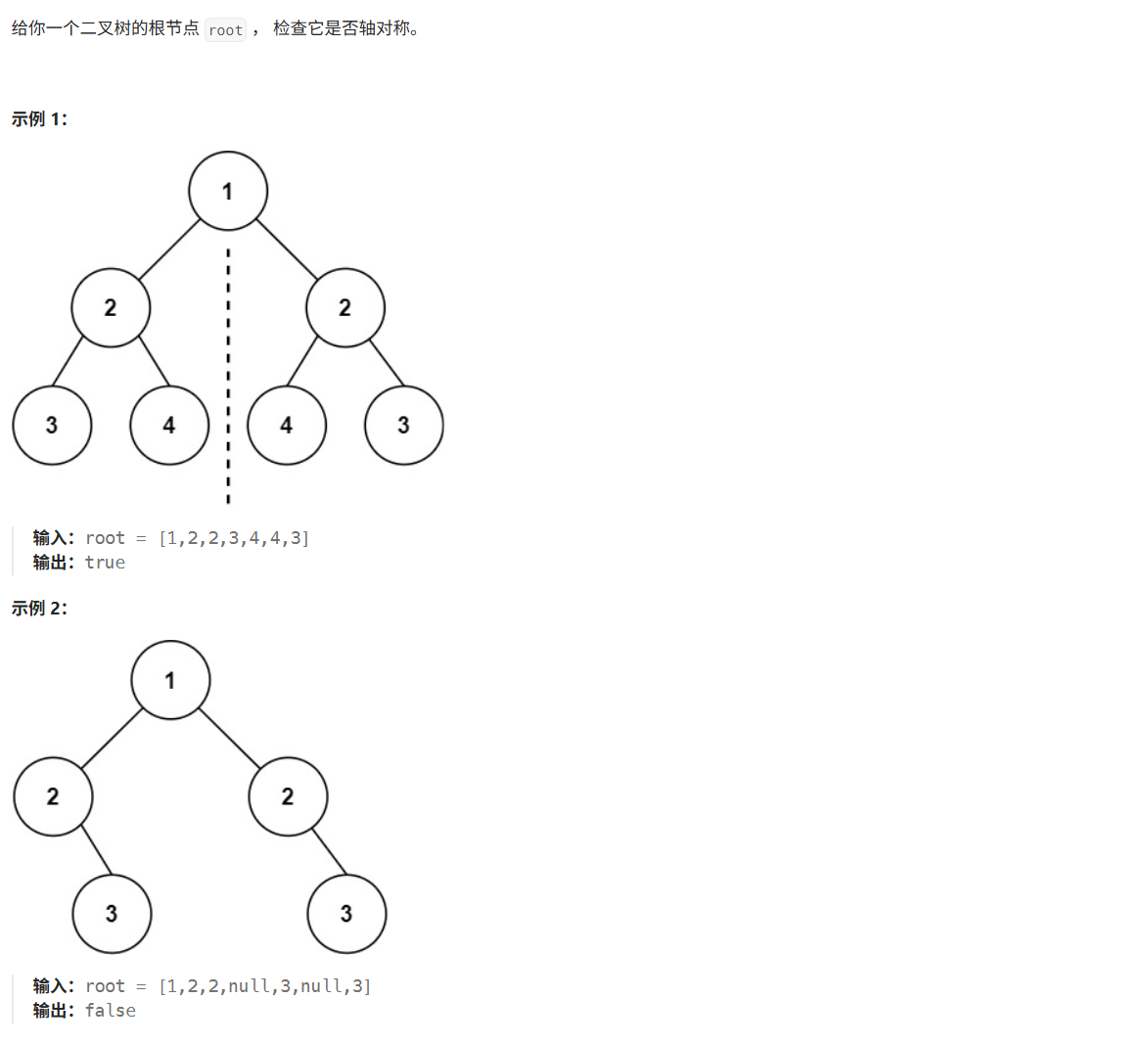 思路:递归法,自下而上,判断左子节点和右子节点、左子节点的左子节点和右子节点的右子节点、左子节点的右子节点和右子节点的左子节点的值是否相同。同时可以采用迭代法层序遍历判断回文数组,不过注意如果是有子节点空节点需要添加标记。