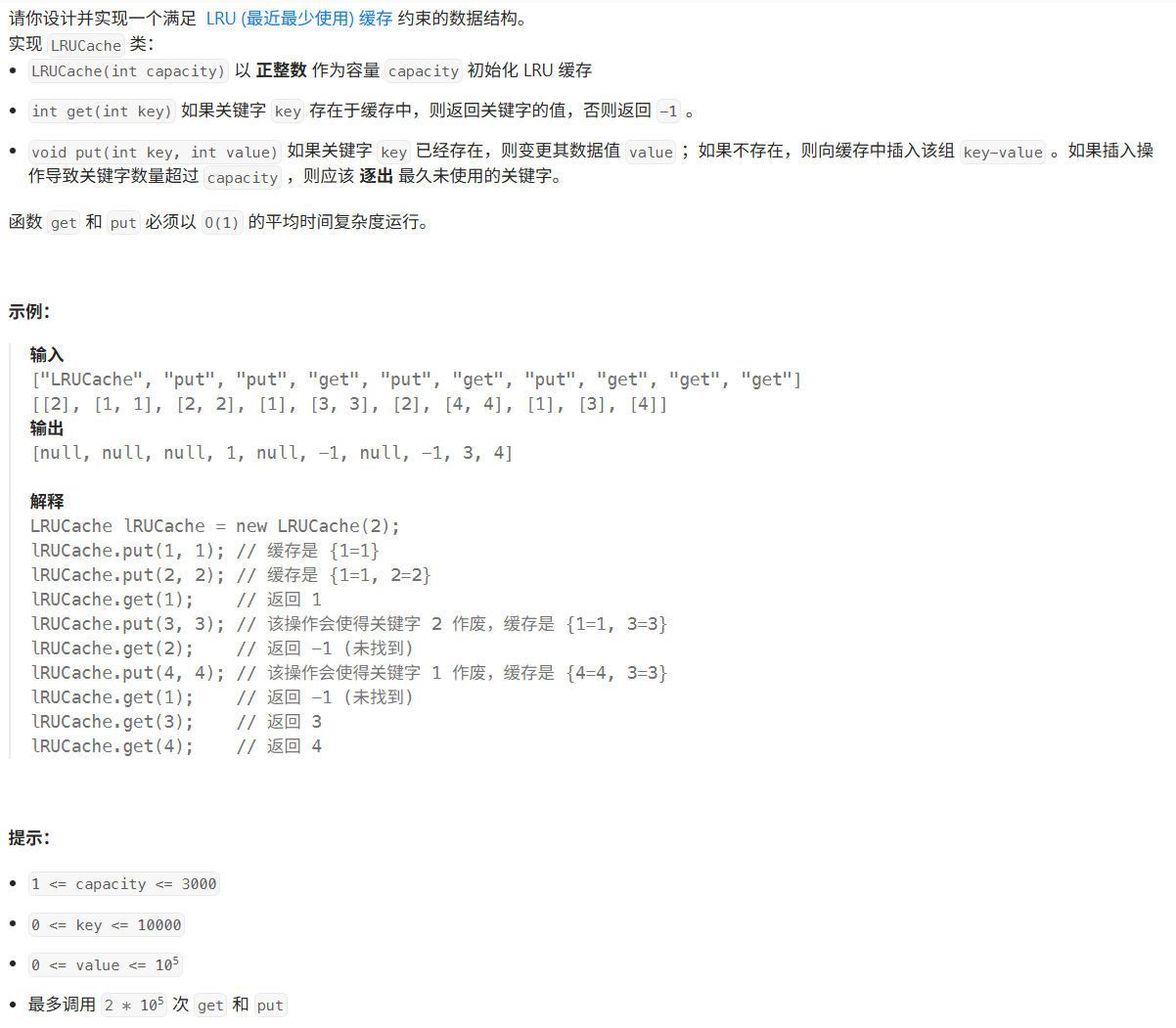 思路:双向链表+哈希表,双向链表存放put的元素,哈希表映射key的节点。