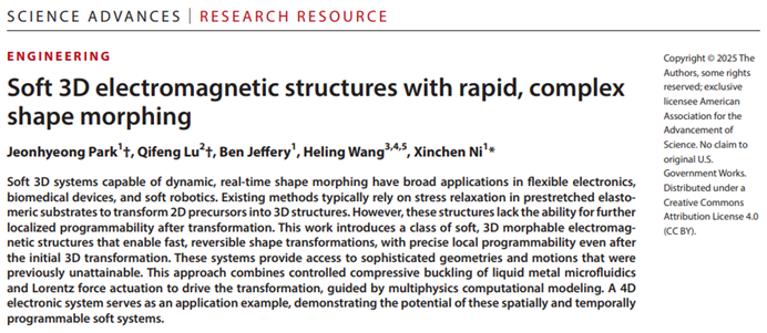 Park, J., et al. Soft 3D electromagnetic structures with rapid, complex shape morphing. Science Advances, 11, eaea5264.