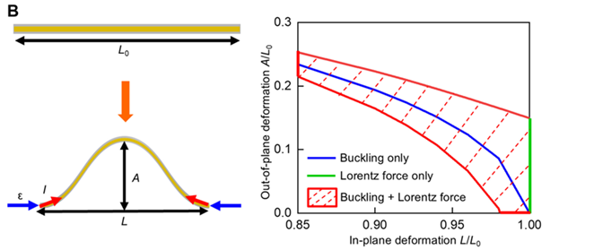 这种双重驱动的优势极为显著:单独使用压缩屈曲或洛伦兹力,仅能实现 1 维变形;而两者结合后,变形空间扩展为 2D 区域。例如,当预应变 εpre=11.1% 时,结构的面外变形可在 16.5%~22.3% 之间连续可调,为精准控制提供了充足空间。
