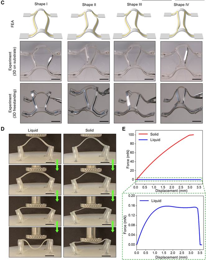 更令人惊叹的是相变带来的刚度巨变:压缩测试显示,液态时结构在 0.16mN 力下就会屈曲;固态时最大承受力可达 100mN,两者相差近 1000 倍 ------ 这种 "软变硬" 的特性,为形状固定提供了坚实的力学保障。