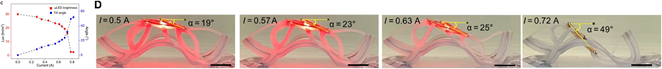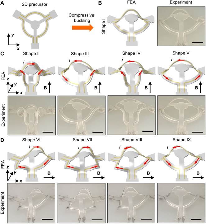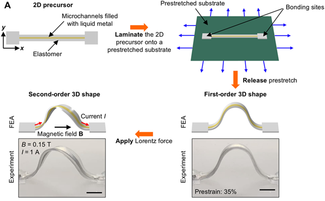 在 1 级 3D 形状基础上,研究引入 "洛伦兹力驱动":在平行于基底的均匀磁场(B=0.15T,由两个直径 76.2mm 的永久磁铁生成)中,向液态金属微通道施加电流(I≈0.9A)。电流与磁场相互作用产生洛伦兹力,驱动结构进一步变形为螺旋、扭曲等复杂高阶构型。
