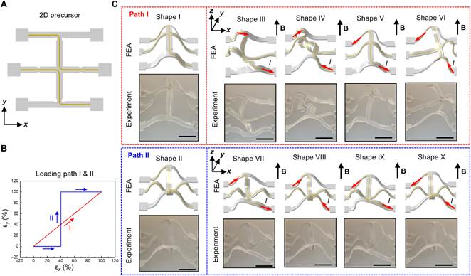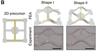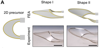 通过 "路径控制压缩屈曲" 技术,改变预应变的释放顺序,可让同一 2D 前驱体形成不同 1 级 3D 形状。例如: