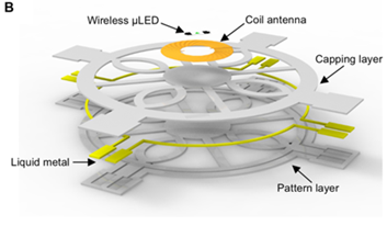 2D 前驱体包含三层关键组件:底层是液态金属微通道,中层是直径 8mm 的线圈天线,顶层是无线供电的 μLED。通过压缩屈曲(εx=εy=28%),μLED 平台被提升至基底上方 10mm 处,形成 1 级 3D 形状。
