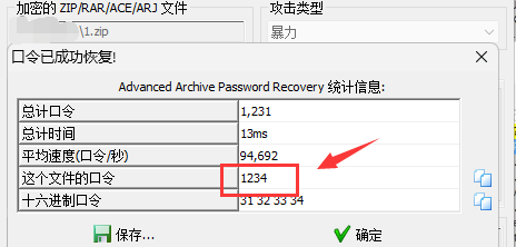 压缩包打开里面文件需要密码,使用口令爆破工具,获得口令 1234