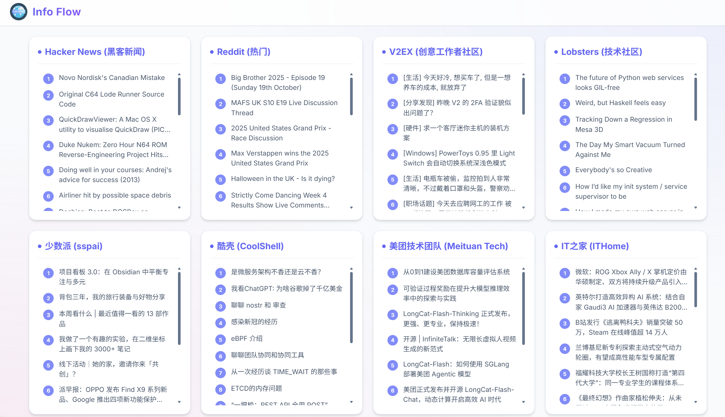 一个名为 Info Flow 的Web应用,将上述分布式采集、数据标准化和权重算法集成在一个简洁的界面中。它通过并列展示多个技术社区的实时热点,体现了对跨领域信息流的高效管理。