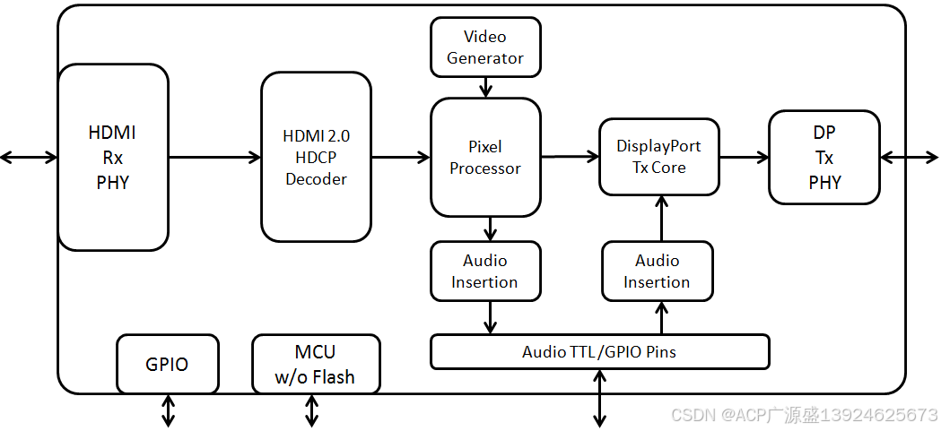 - 音频提取:支持从 HDMI 输入中提取多声道音频(如 LPCM 7.1、Dolby Digital Plus),通过 I2S 或 SPDIF 接口输出至外部音频设备。