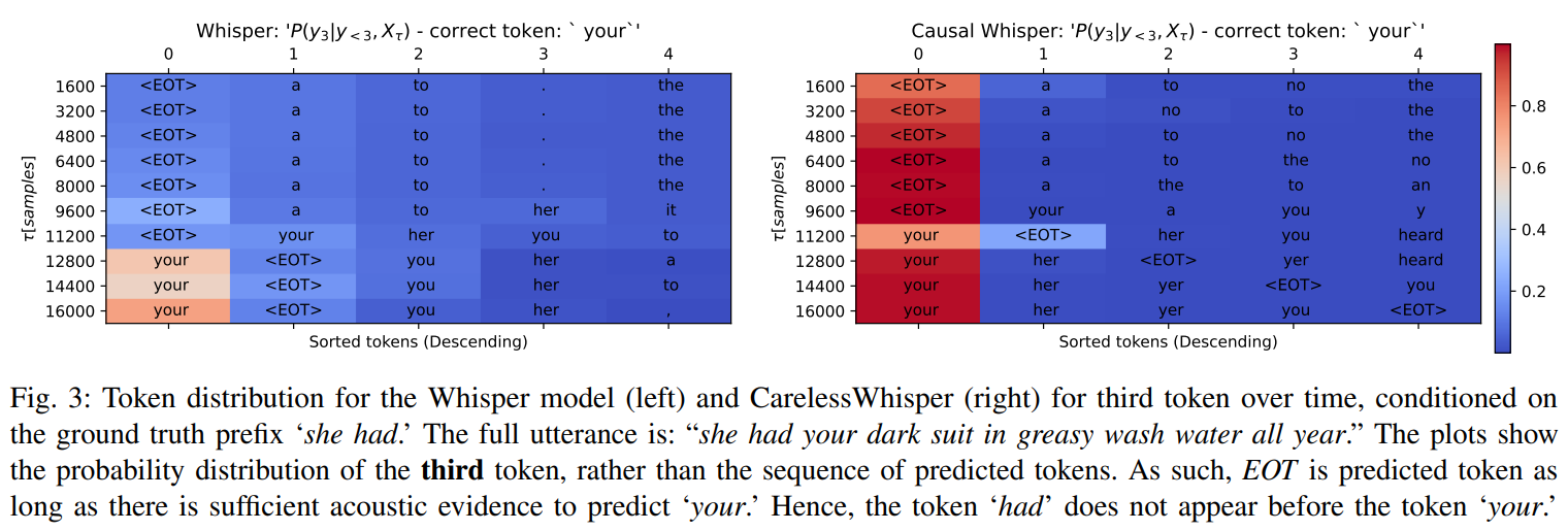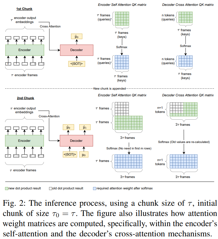 - 自注意力(看之前Token):没法直接缓存,因为新语音会改变解码器的上下文,导致Token的嵌入变化,之前的自注意力结果就不准。作者的分析:很多Whisper的交叉注意力头不是时间对齐的,新语音会让交叉注意力输出变,进而影响自注意力,所以自注意力缓存暂时不可行。