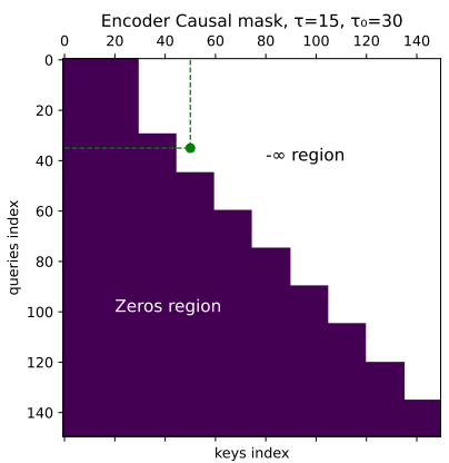 - 分初始分块 τ 0 τ_0 τ0和后续分块 τ τ τ:初始分块(比如600毫秒)内所有帧可以互看(要先攒点语音保证准确性),后续分块(比如300毫秒)里,第 i i i帧只能看和它同属一个分块或更早分块的帧。