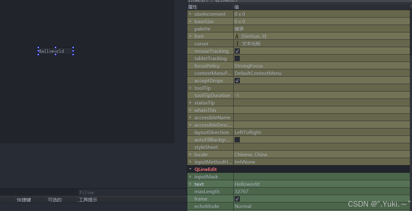 widget.ui文件,进入设计模式; - 在左侧 "组件选择窗口" 中,找到 "Display Widgets"->"LineEdit"(标签),拖拽到中间的 UI 设计窗口;