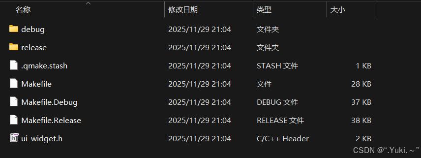 build-faststart-Desktop_Qt_5_14_2_MinGW_64_bit-Debug 其中包含了Makefile以及自动生成的ui_widget.h头文件: