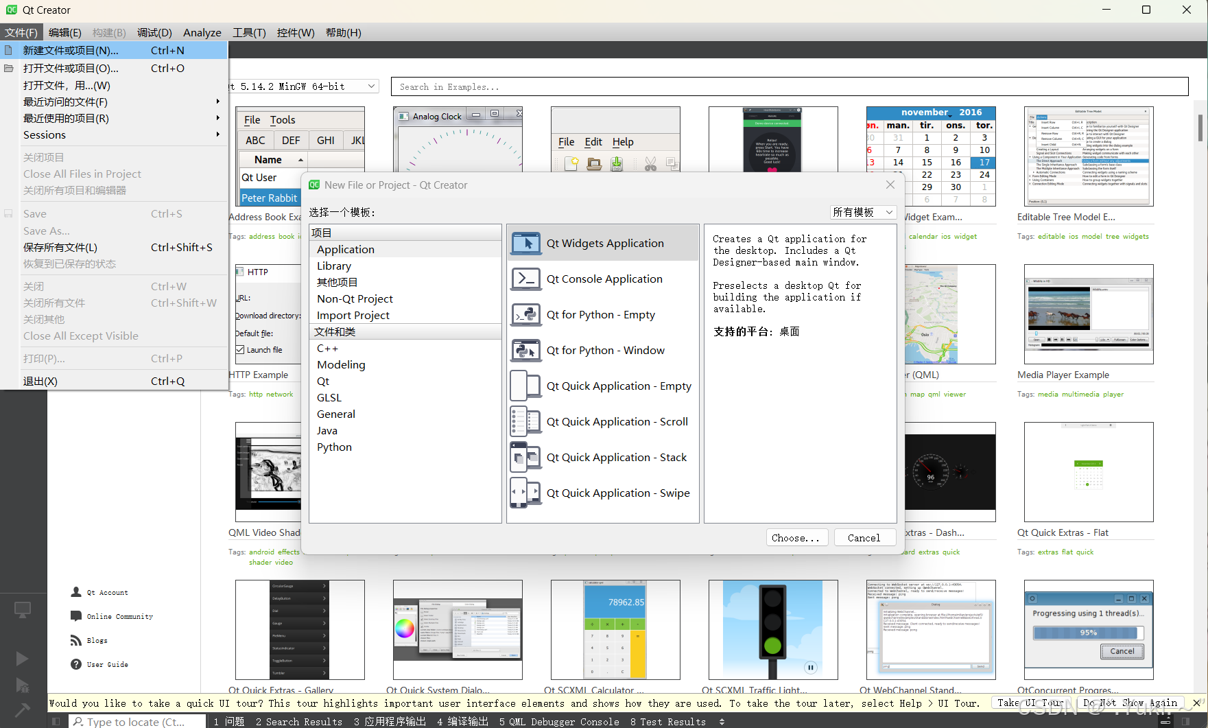 - 打开Qt Creator,进入"欢迎模式"->"示例";
