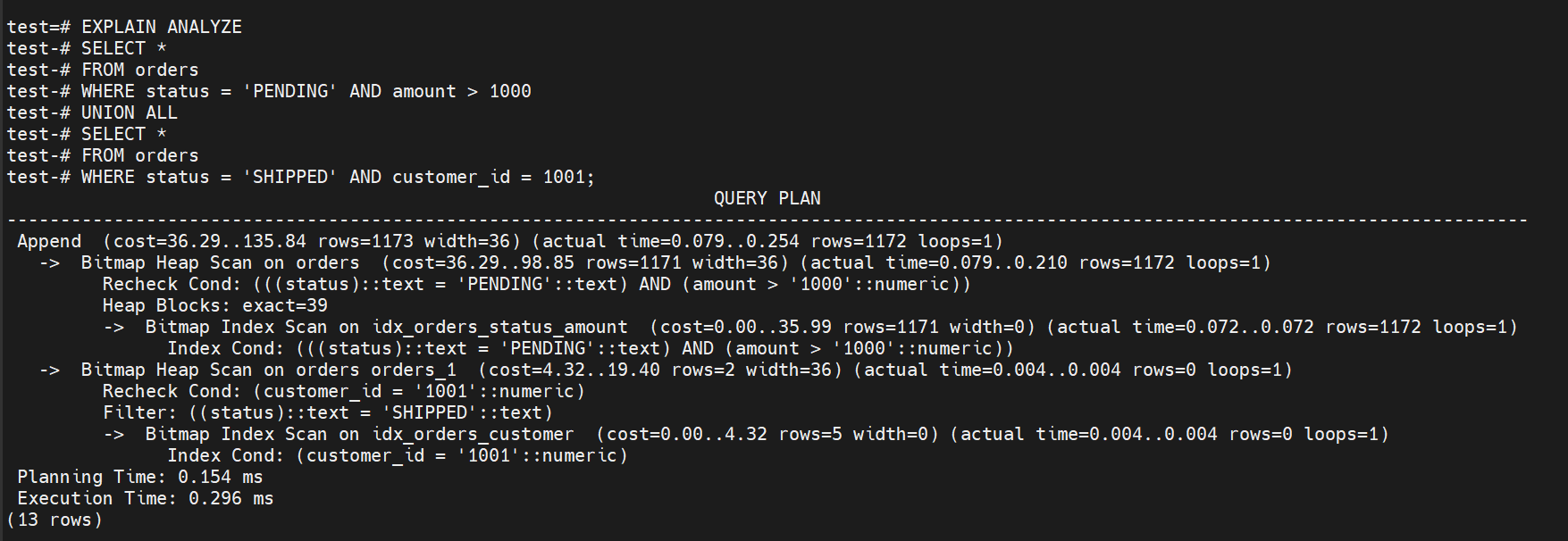 UNION ALL版本略快(0.296ms vs 0.306ms)