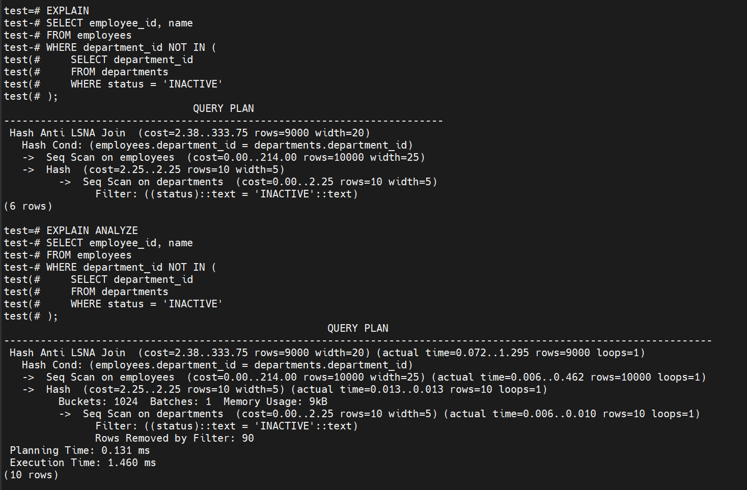 在员工管理系统中,需要查询所有不在"非活跃部门"的员工信息。原始使用NOT IN子查询,当部门表数据量增大时,性能急剧下降。