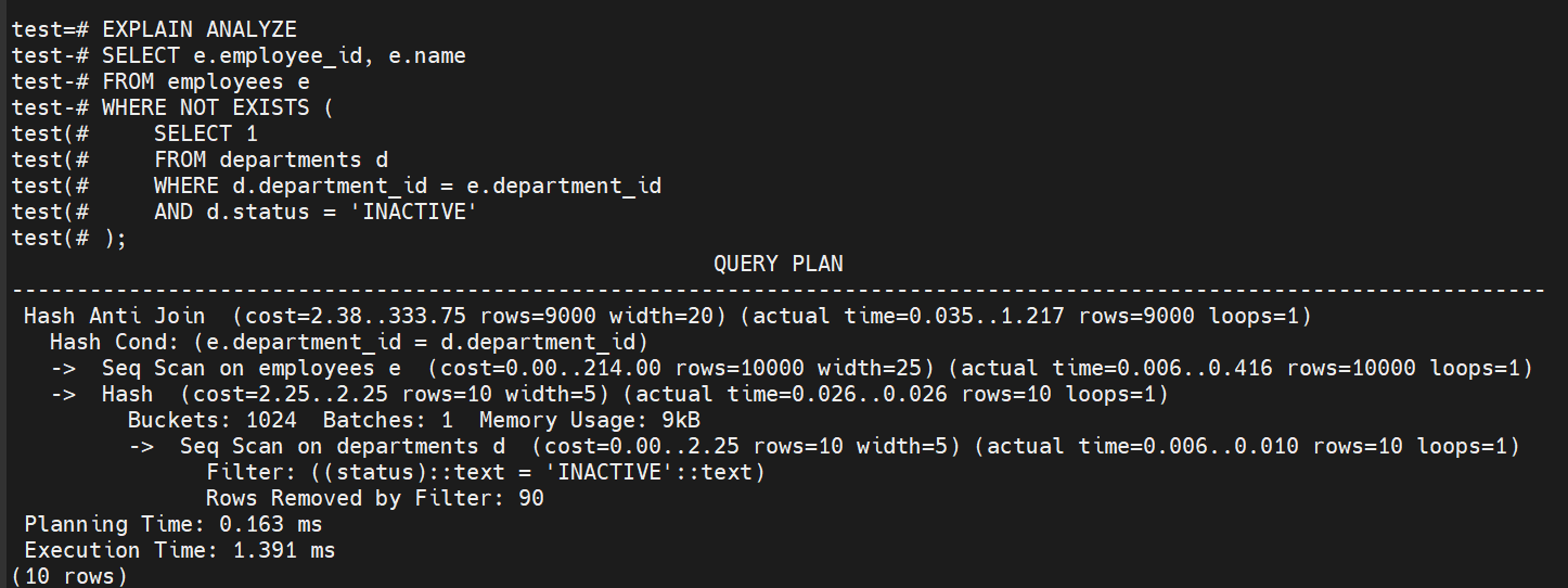 当前性能:两种写法性能相当,NOT EXISTS 稍快(1.217ms vs 1.295ms)