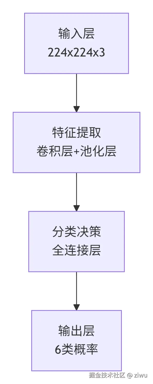 如上所示利用ResNet50进行图像识别的典型流程:加载预训练模型、对输入图像进行标准化预处理、执行前向传播预测,并解码得到人类可读的类别标签及置信度。在实际植物识别项目中,我们会在ResNet50的基础上进行迁移学习 ,即保留其强大的特征提取能力,替换并重新训练最后的全连接层,使其适应我们自定义的6种树叶分类任务,从而在小规模数据集上也能达到较高的识别精度。 以下是一个简化版CNN图像识别流程