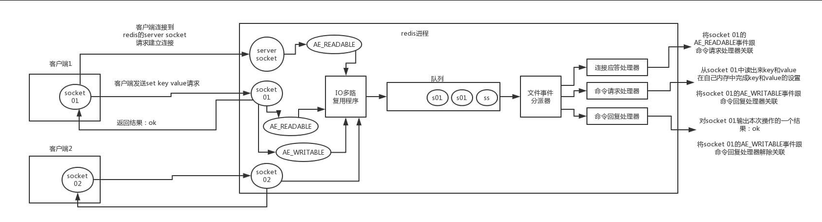 3、如果此时客户端准备好接收返回结果了,那么 Redis中的 Socket01 会产生一个AE_WRITABLE 事件,同样压入队列中,事件分派器找到相关联的命令回复处理器,由命令回复处理器对 Socket01 输入本次操作的一个结果,比如 ok ,之后解除 Socket01的